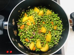Συνεχίζουμε και προσθέτουμε στην κατσαρόλα τον αρακά Μπάρμπα Στάθης, και σοτάρουμε για 6-7 λεπτά. Σε ένα φλιτζάνι με ζεστό νερό έχουμε ετοιμάσει τον ζωμό λαχανικών τον οποίον τον ρίχνουμε αμέσως μετά την κατσαρόλα μας.